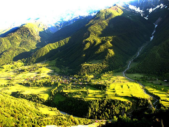 Ein gut fünf- bis sechsstündiges kaum anstrengendes Wandern führt Sie zum Ursprung des sagenumwobenen Flusses Enguri. Zunächst geht der Weg am Fuße des Berges Mentasch entlang, dann immer in die Richtung Tetnuldi, die von ewigen Gletschern umgeben ist, vor Augen. Von der anderen Seite, im Tal hat man einen schönen Blick über wunderschön gelegenen Wehrturmdörfer. Nach ein paar Serpentinen tut sich schon im Nordwesten der Ushba auf. Verzaubert sind das Enguri –Tal, die wundervollen Wiesen, mit alpinen Blumen und Orchideen. Das Bergdorf Uschguli, wo die Zeit stehengeblieben ist und einen legendären Stellenwert in Georgien hat, fasziniert durch ihre malerischen Kulissen in unberührter Natur. Von hier gehen die Wanderungen zum Schchara- Gletscher, zur „Lamaria“ Kirche (10. Jh.), sowie zur Festung der Königin Tamar.